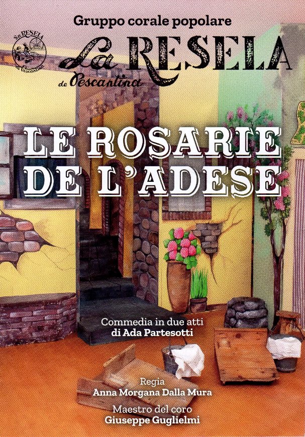 Le Rosarie de l'Adese Protagonista di questa opera teatrale è la piazza, "la Resela" contornata da case, botteghe ed ostaria dove un tempo si svolgeva la vita della comunità. Vicoli e piccole stradine portavano "zo de soto", lungo il fiume, dove i bambini giocavano, i ragazzi incontravano le ragazze lontano dagli occhi degli adulti, o così credevano, e le donne con le "brele" lavavano i loro panni tra una "ciacola" e l'altra, mentre le giovani ragazze si guadagnavano la "dota" lavorando duramente nella filanda di Pescantina. Gli uomini che tornavano dal duro lavoro dei campi trovavano ristoro nella piccola ostaria del paese e dopo "en bicer de quel bon" tornavano nelle loro case. Un intreccio di vicissitudini animano la piazza, in questa commedia teatrale, un insieme di scene di vita paesana che sono il frutto del lavoro di scrittura di Ada Partesotti, la prima regista del Gruppo la Resela che con la sua ricerca sul piano sociale e culturale della nostra terra e della nostra gente alla fine dell' 800, ha saputo creare con maestria, cura e passione, una scrittura originale che ad oggi sentiamo ancora profondamente rappresentativa delle nostre radici. Questa commedia è dedicata ad Ada Partesotti nel centenario della sua nascita. personaggi: el cantastorie, so moier e so fiol LE DONE LE BUTELE I BUTELETI E LE BUTELETE l'osta